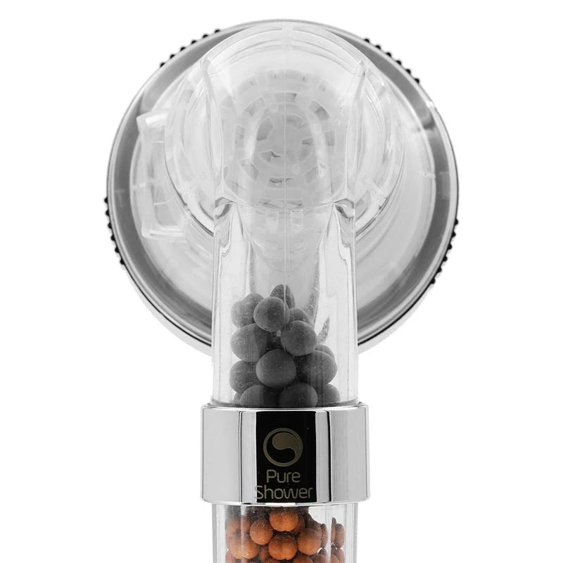 Pure Shower , filtración iónica con 3 tipos de perlas minerales. Nuestro sistema de triple filtración utiliza turmalina, sulfito de calcio y perlas de piedra Maifan para ayudar a reducir el cloro, fluoruro y metales para aumentar la purificación del agua, y mantener un nivel de pH más equilibrado.